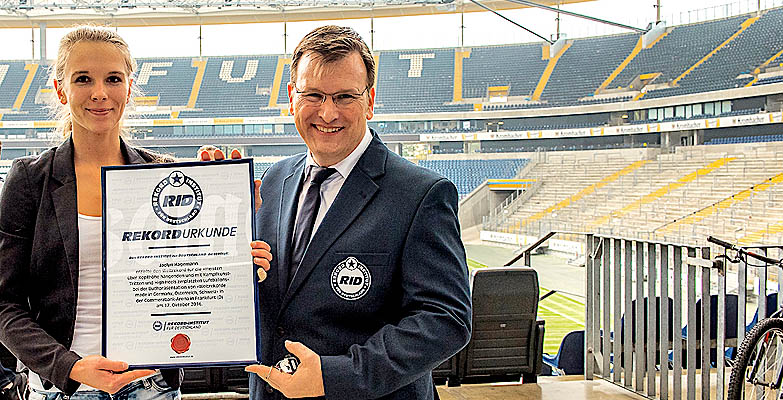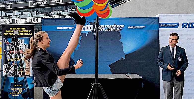 Standfest und trittsicher war Taekwondo-Sportlerin Jaclyn Hagemann aus Hamburg, die am 17. Oktober 2016 in der Commerzbank-Arena Frankfurt bei der Veröffentlichungspräsentation von »Weltrekorde made in Germany, Österreich, Schweiz« im »High-Heel-Ballon-Kick« überzeugte.