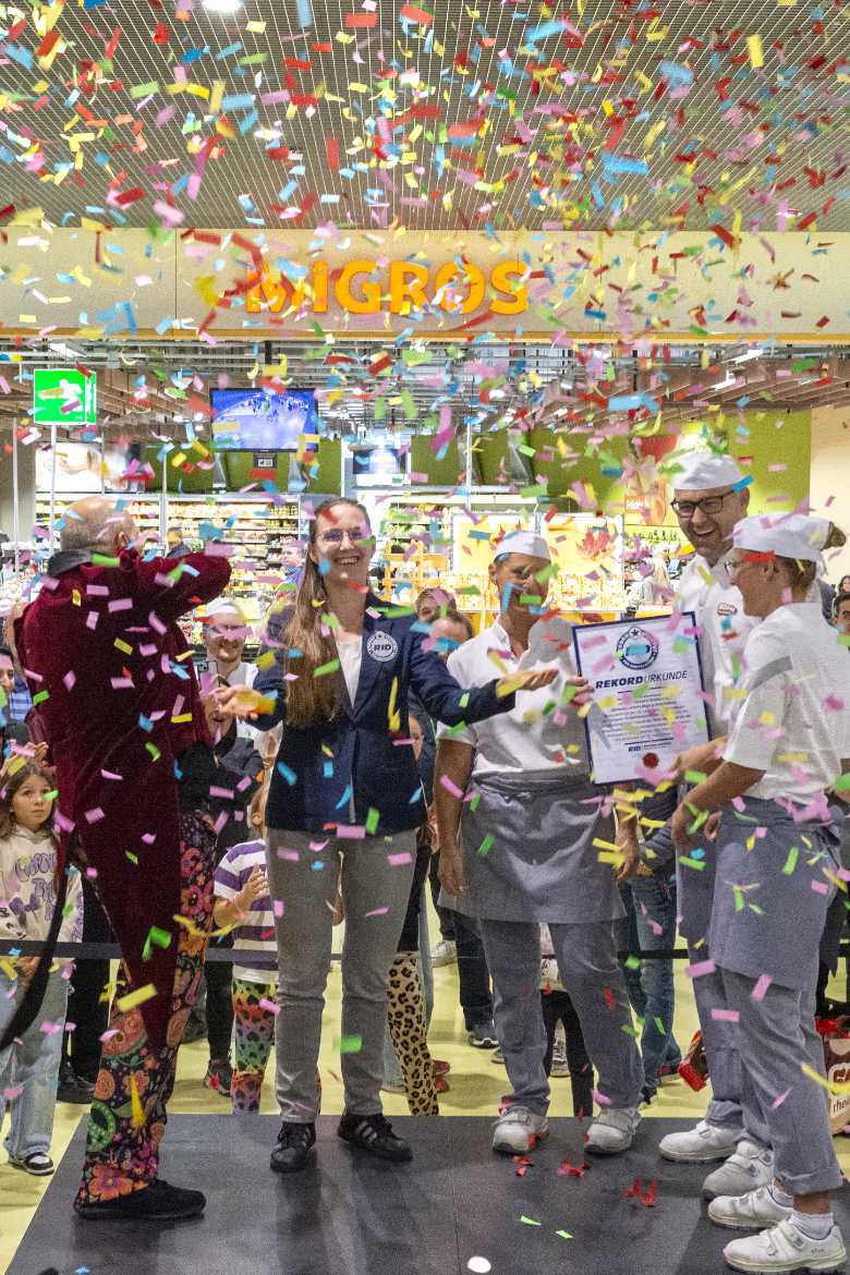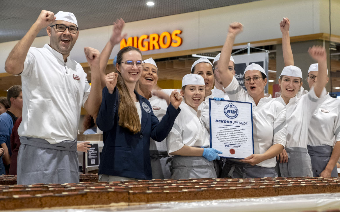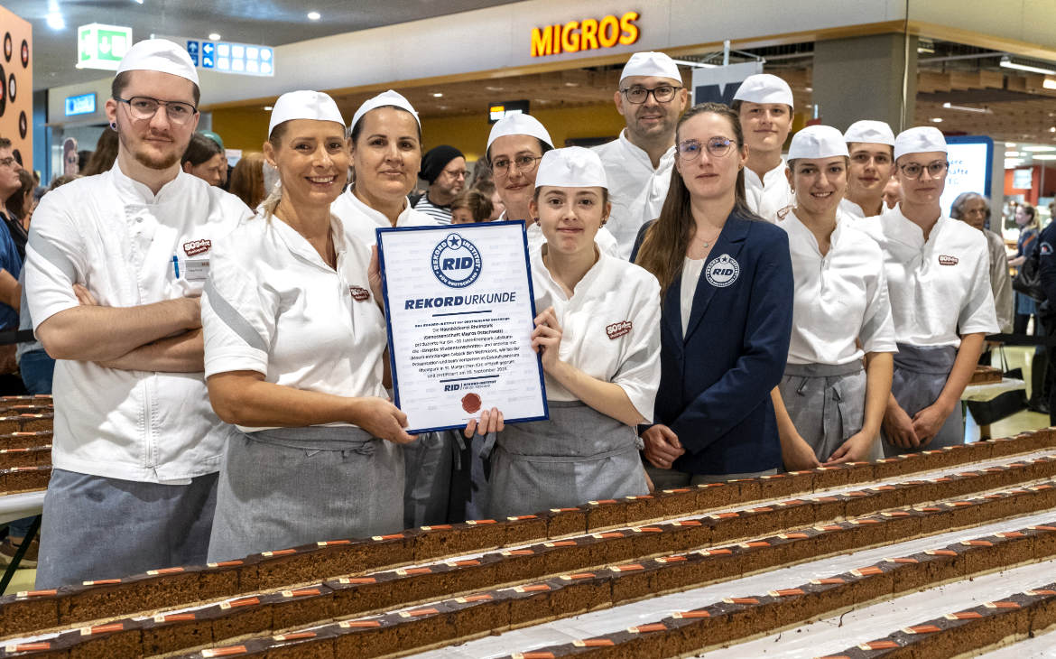 Feierlich zeichnete Janz den frischgebackenen Weltrekordhalter Ostoja Obrenovic und sein Team der Rheinpark Hausbäckerei mit der offiziellen RID-Rekordurkunde aus. Dann begann endlich der Verkauf der Studentenschnitte. Der Erlös wurde vollumfänglich an die Organisation »Rhyboot« gespendet, die Lebens- und Arbeitsräume für erwachsene Menschen mit unterschiedlichen Beeinträchtigungen ermöglicht.Fotos: Genossenschaft Migros Ostschweiz