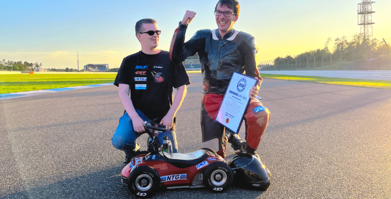 Doch der Rekordjäger wollte mehr und unternahm zwei weitere Fahrten – die das Ergebnis allerdings nicht verbessern konnten. Rekordrichterin Kuchenbecker bestätigte insofern mit 148,45 km/h den neuen Weltrekord für die »höchste Geschwindigkeit auf einem modifizierten Bobby-Car mit E-Antrieb«. Verschwitzt, aber glücklich nahm Marcel Paul vor versammelten Journalisten, Freunden und Familienmitgliedern seine verdiente RID-Rekordurkunde entgegen.Fotos: Daniel Mohr (4); RID (3)