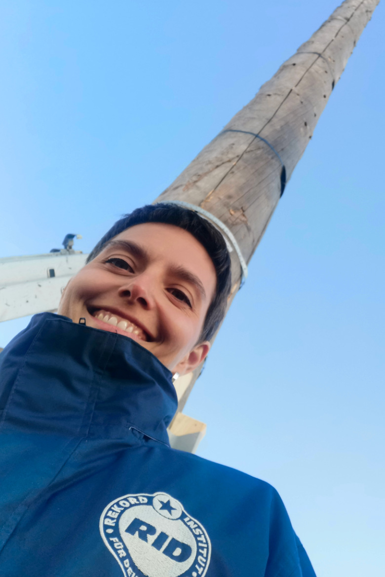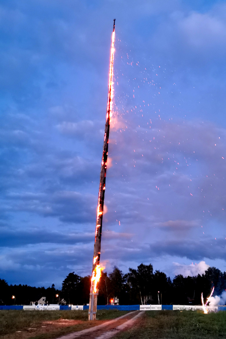 Unsere Rekordjäger gehen jedoch anders vor, denn ihre Fichte ist schwindelerregende 34 Meter hoch. Ganze fünf Jahre lang wurde die Fichte getrocknet, denn Altholz brennt besonders gut. Die Bearbeitung der Fichte zur Fackel dauerte zwei Tage. Der Baumstamm wurde dafür »kreuzweise eingesägt und mit Metallbändern wieder zusammengefügt und verschraubt um eine gleichmäßige Verbrennung über die gesamte Länge des Stammes zu gewährleisten«, erklärte Sebastian Müller.