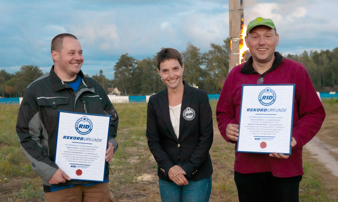 Das Event »Der Baum brennt« wurde liebevoll vorbereitet. RID-Rekordrichterin Ricarda Pastuszek war am 28. September persönlich nach Dauban gekommen, um den Rekordversuch zu überwachen. Am späten Nachmittag gab es zunächst die Vermessung der Fichte mit Maßband und Steiger, worauf die Entzündung des Baums mittels Bengalos folgte. Gut eine Stunde später brannte der Stamm lichterloh – ein eindrucksvoller Anblick.