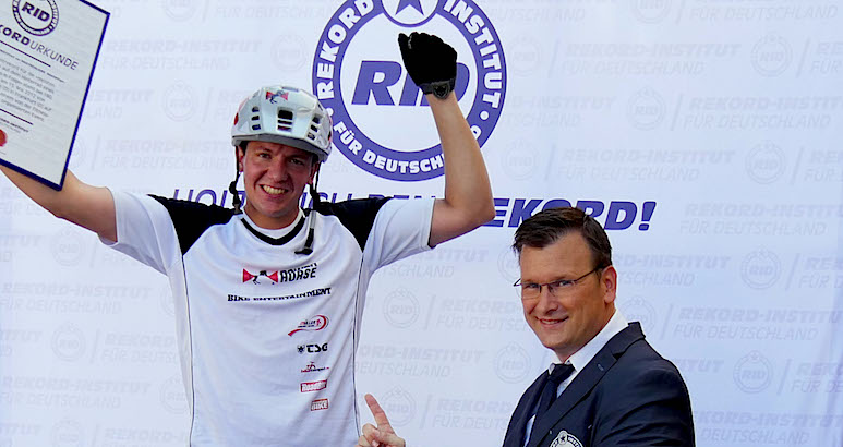Und so schaffte es Max dann tatsächlich, mit Ablauf der vorgegebenen Zeit den letzten erfolgreichen Sprung zu absolvieren. Mit 31 sichert er sich den Weltrekord für die »meisten Fahrradsprünge über am Boden liegende Personen (1 Min)«, der noch in der Sendung von Rekordrichter Olaf Kuchenbecker für das REKORD-INSTITUT für DEUTSCHLAND zertifiziert und mit der Übergabe einer Weltrekordurkunde bestätigt wurde.