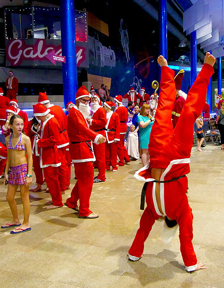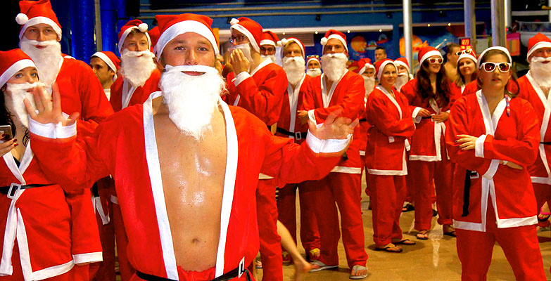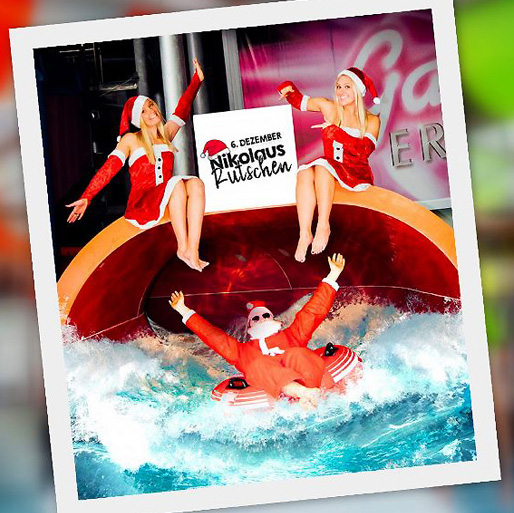 Roter Mantel oder Umhang, rote Mütze, und einen weißen Rauschebart. Hierzulande weiß jedes Kind, wie sich der Nikolaus traditionell kleidet, und dass er jedes Jahr am 6. Dezember die Stiefel der Kinder mit Geschenken füllt. Aber wie sieht ein Nikolaus aus, der gerade eine Wasserrutsche hinuntergesaust ist?