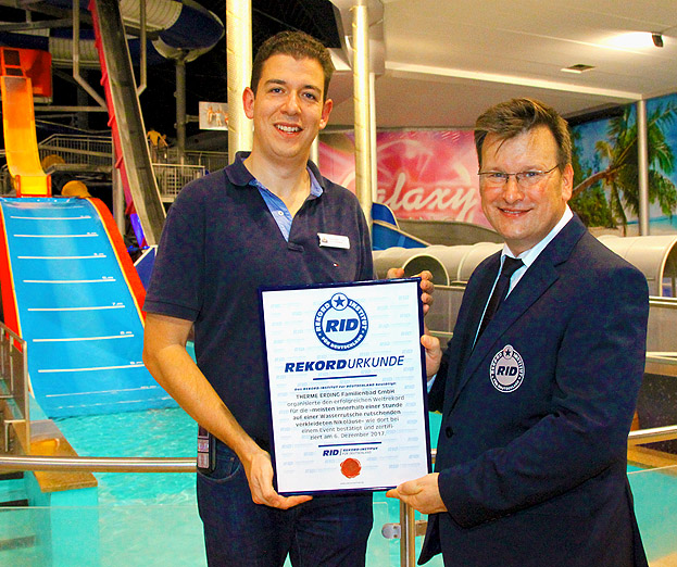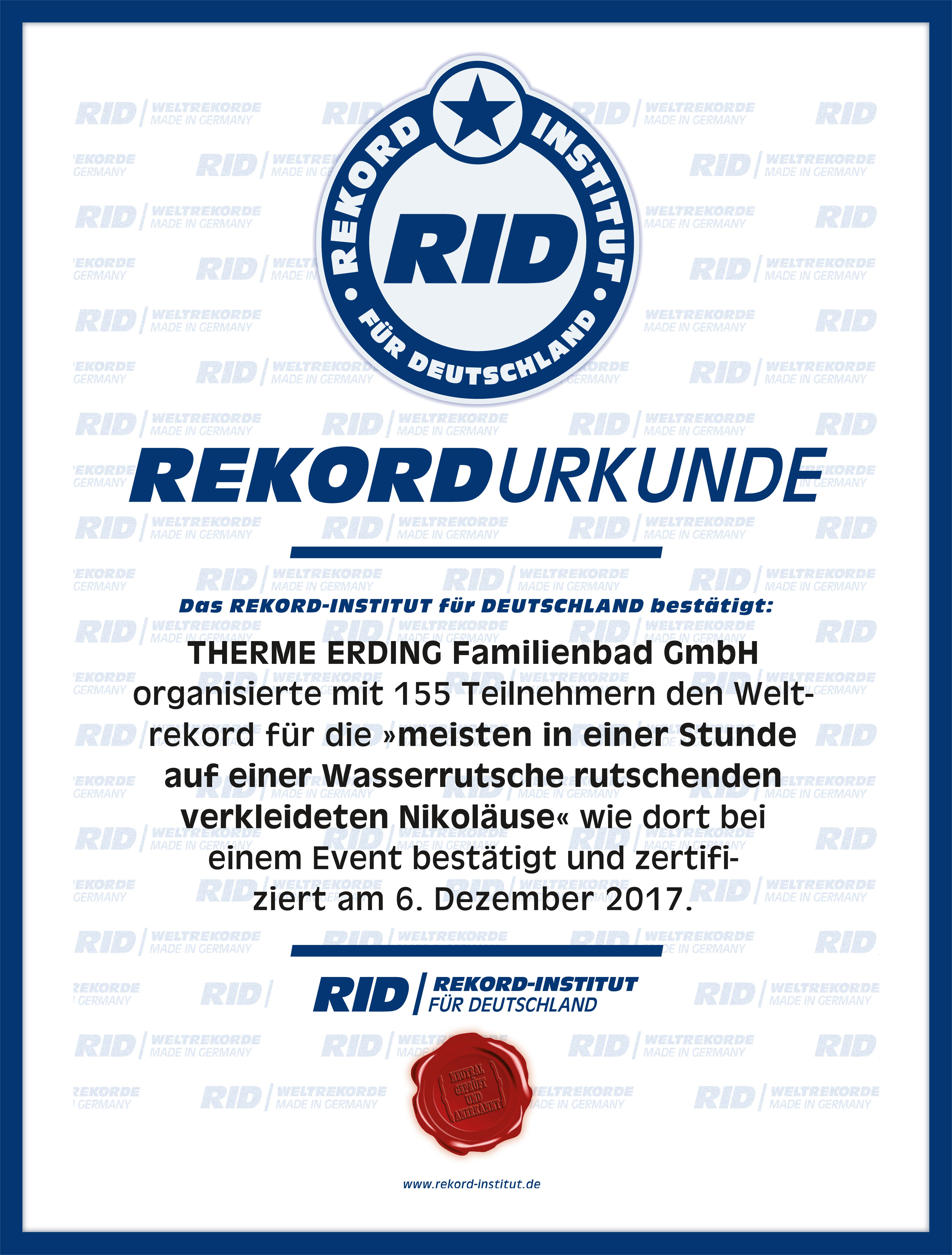 Dies konnten die Badegäste der Therme Erding in der nordöstlich von München gelegenen bayerischen Kleinstadt am 6. Dezember 2017 herausfinden. Denn zu diesem besonderen Tag hatte das Familienbad einen Weltrekordversuch in Nikolaus-Rutschen organisiert. Für den Erstrekord der Kategorie »meiste innerhalb einer Stunde auf einer Wasserrutsche rutschenden verkleideten Nikoläuse« hatte das Rekord-Institut für Deutschland mindestens 100 verkleidete Nikoläuse gefordert, die nacheinander eine Wasserrutsche hinunterrutschen.