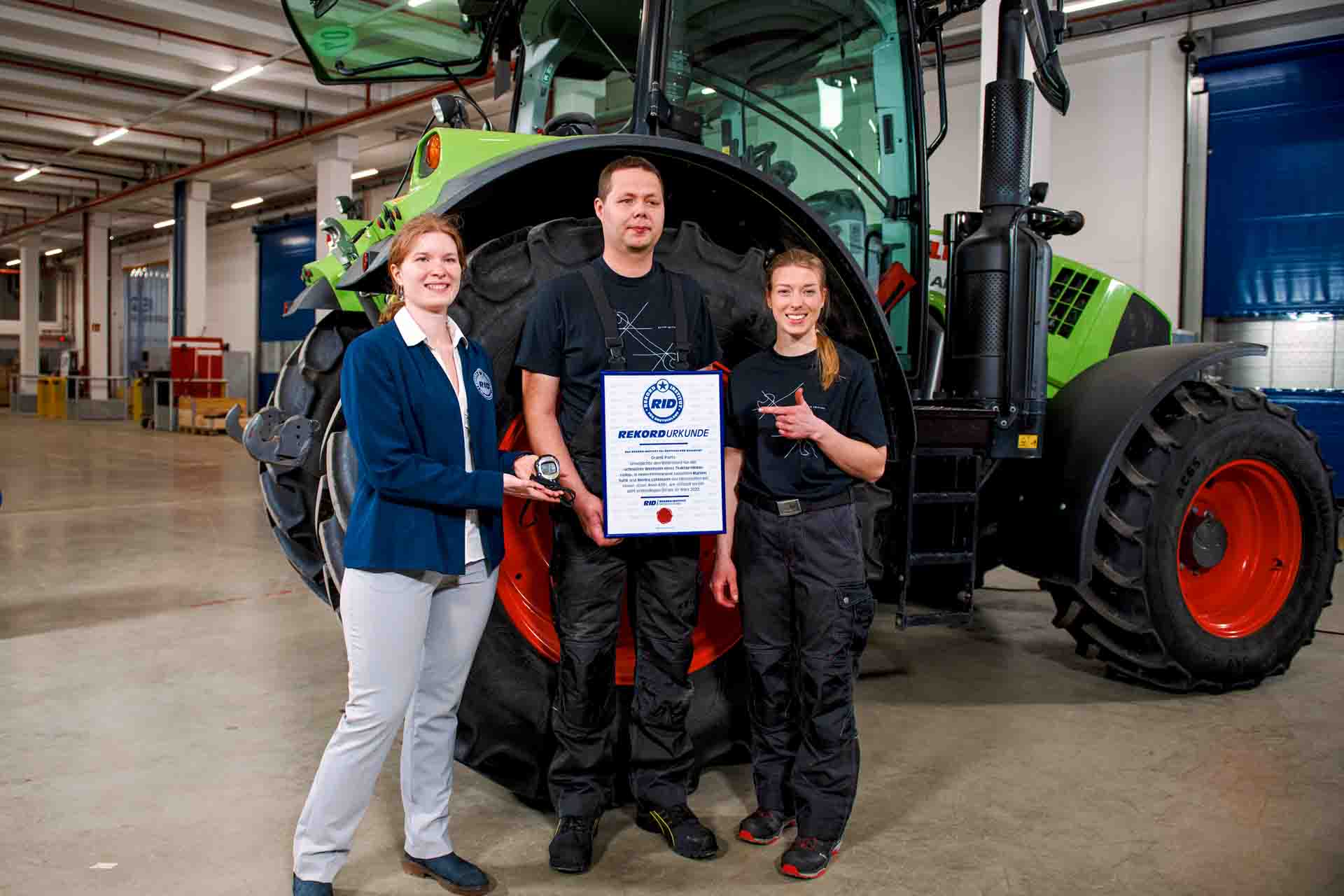 Nach dem Herunterlassen beendet RID-Rekordrichterin Laura Kuchenbecker die Zeitnahme und zertifiziert nach kurzem Blick auf die Stoppuhr den neuen RID-Weltrekord. Mit 3 Minuten 16 Sekunden erzielen Mariam Sukh und Menko Lottmann offiziell das »schnellste Wechseln eines Traktor-Hinterrades« und werden mit einer der begehrten RID-Rekordurkunden ausgezeichnet.