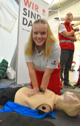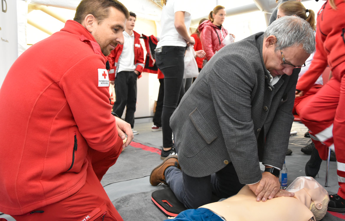 Nach einer kurzen Einweisung durften alle teilnehmen – sogar ganze Schulklassen und Vereine kamen vorbei, um das Österreichische Rote Kreuz zu unterstützen. Dies zeigt, dass jeder von uns Wiederbelebungsmaßnahmen einleiten kann. Im Ernstfall können diese Maßnahmen lebensentscheidend für die betroffene Person sein.