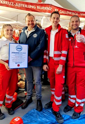 Mit 60 Stunden erzielte die »Rotkreuz-Abteilung Bludenz – St. Gallenkirch – Sonntag« den Weltrekord für die »längste Reanimation (Staffel)«. Sofort wurden die Organisatoren mit der verdienten RID-Rekordurkunde ausgezeichnet.