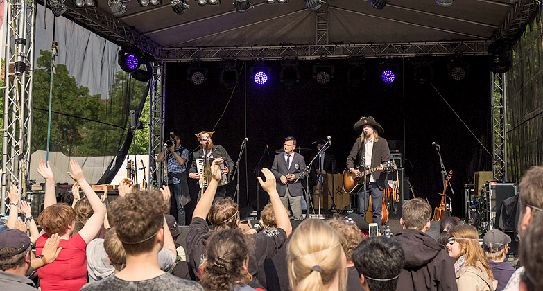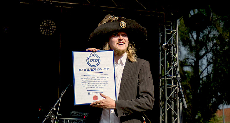 Das Plattenlabel Timezone rief anlässlich der Maiwoche in Osnabrück (D) zu einem außergewöhnlichen Massentanz-Weltrekordversuch auf. Als Pate dafür fungierte die Band »Mr. Hurley & die Pulveraffen«, die stets in aufwändigen Piratenkostümen und mit Augenklappe auftreten und bei Konzerten mit ihren Fans auf akustische Schatzsuche gehen. Ehrensache, dass sie am 19. Mai 2016 bereits am Nachmittag persönlich dabei waren, um die Rekordjäger von der Bühne auf dem Ledenhof aus zu dirigieren, und mit ihren live gespielten Songs zu tänzerischen Bewegungen zu animieren.