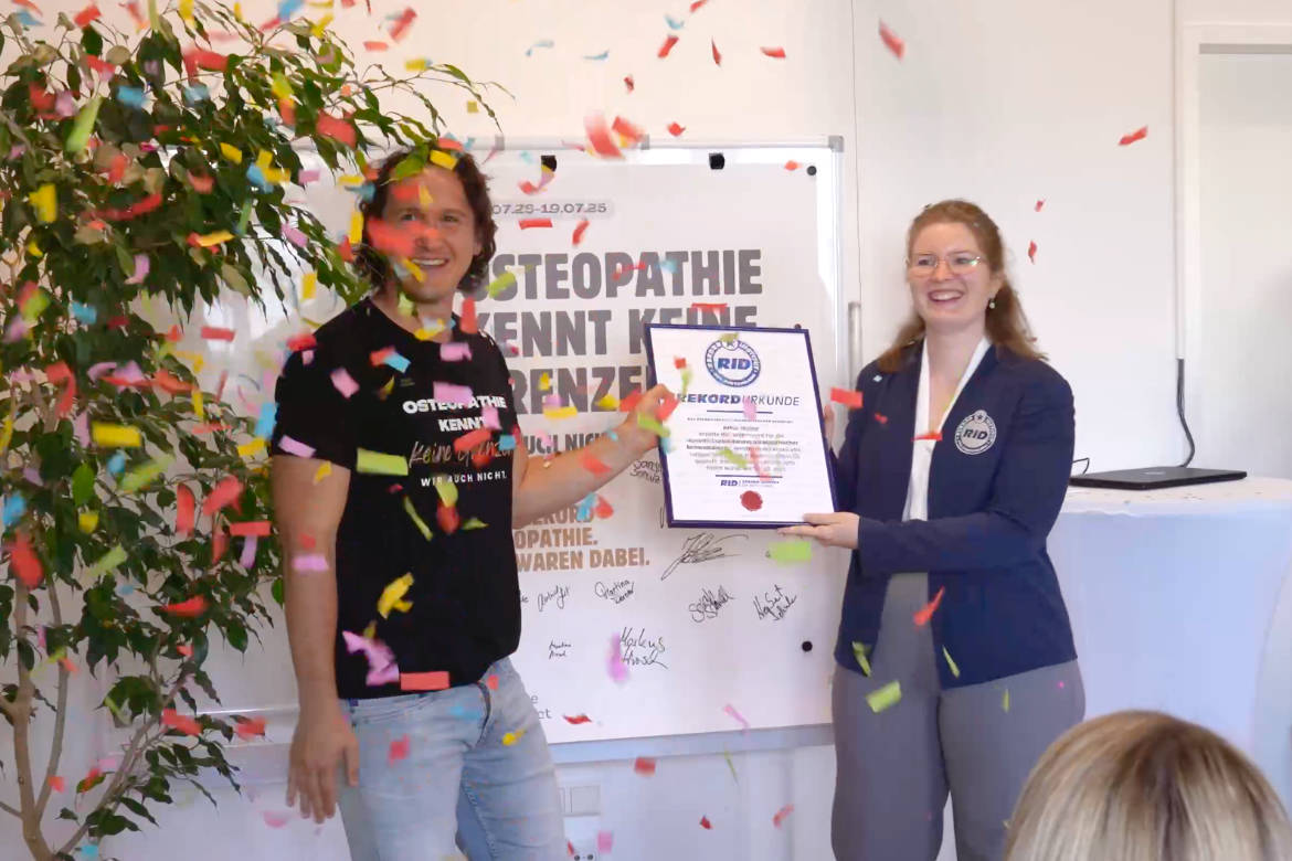 Mit 25 Stunden zertifizierte Rekordrichterin Kuchenbecker den neuen Weltrekord für die »längste Durchführung osteopathischer Behandlungen« und zeichnete den Osteopathen im Konfettiregen mit seiner verdienten Rekordurkunde aus. Alle Einnahmen wurden an das Osteopathische Kinder-Zentrum Filumi gespendet, das sich für die Verbesserung der Lebensqualität schwer erkrankter Kinder einsetzt.Fotos: Praxis »Unique Connect«