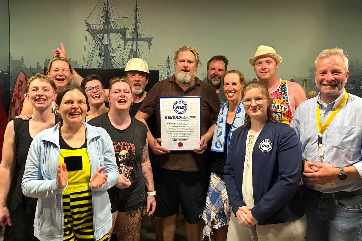 Bereits um 17:30 Uhr gab es den ersten Grund zum Feiern: Der neue Weltrekord wurde erreicht! Doch Schluss war tatsächlich erst nach dem letzten Aufguss um 23 Uhr, den das Team dann gemeinsam durchführte. Nach 12 Stunden 12 Minuten und dem 61. Aufguss zertifizierte Rekordrichterin Kuchenbecker den Team-Weltrekord für den »längsten Sauna-Aufguss«. Anschließend zeichnete sie das gesamte Team vom BadeWerk Neuharlingersiel unter großem Jubel der anwesenden Gäste mit der verdienten RID-Rekordurkunde aus.Fotos: Kurverein Neuharlingersiel e.V.