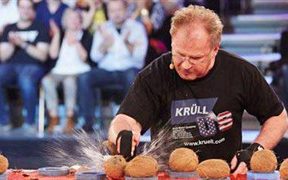Muhamed „Hammerhand“ Kahrimanovic (D) versuchte den Rekord für die meisten in einer Minute mit der Handkante zerschlagenen Kokosnüsse zu steigern, der er selbst im Juni 2011 auf 118 zerschlagene Nüsse geschraubt hatte.