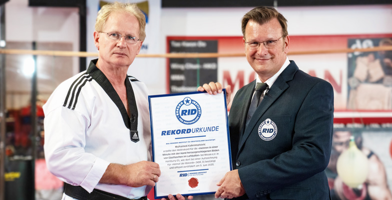Am 9. Juni 2020 kamen RID-Rekordrichter Olaf Kuchenbecker und ein Team der TV-Sendung »Rekorde des Nordens – präsentiert von Olivia Jones« (NDR, D), zum Teakwondo-Studio »MoSan e.V.« des mehrfachen Weltrekordhalters nach Hamburg (D). Zur mentalen Unterstützung dabei sind Ehefrau Emine Dzemali sowie die Taekwondo-Schüler des Wahlhamburgers. Widmen möchte Kahrimanovic den Rekordversuch dem jüngsten Familienmitglied: zu Ehren von Neu-Enkel Adam soll der Weltrekord kraftvoll und feinfühlig nach Hause geholt werden, als zusätzlicher Ansporn für den frischgebackenen Großvater. Um den Weltrekord zu erzielen, muss jedoch zunächst die Leistung stimmen, und die hat es in sich: in einer Minute muss Hammerhand mindestens fünf Glasflaschen den Boden herausschlagen, die dabei in aufgeblasenen Luftballons platziert sind und an Bändern von oben herabhängen. Die Rekordaufgabe: Der umgebende Ballon darf beim Schlag nicht kaputt gehen, damit eine zerschlagene Flasche für den Rekord gewertet werden kann.