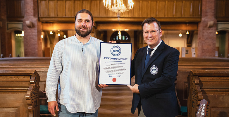 Viele Menschen begnügen sich in ihrem Leben damit, zumindest ein Instrument zu spielen. Sebastian Sack aus Greifswald (D) beherrscht sogar einige mehr. Grund genug, den Multi-Instrumentalisten in der ersten Folge von »Rekorde des Nordens – präsentiert von Olivia Jones« (NDR, D) am 7. August 2020 zu zeigen. Ebenfalls in Greifswald dabei war RID-Rekordrichter Olaf Kuchenbecker, der sich von Sacks Rekordeignung persönlich überzeugen wollte.