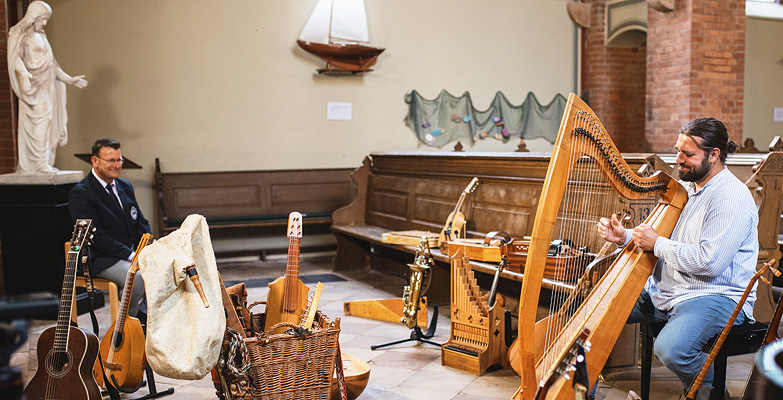 Stilechter Schauplatz des offiziellen Rekordversuchs war eine Kirche in Greifswald, für eine gute Akustik war also gesorgt. Eine Vielzahl von exotischen Instrumenten wartete schon auf ihren Einsatz. Wohlklingende Namen wie »Duduk«, »Portativ« oder »Bandurria« sagen dem geneigten Laien vermutlich nichts. Dabei handelt es sich um ein Holzblasinstrumente mit Doppelrohrblatt, eine mittelalterliche Schoßorgel und eine sogenannte Kurzhalslaute. Sebastian Sack kennt sie alle und kann sie alle spielen. Für das Kamerateam und RID-Rekordrichter Olaf Kuchenbecker gab es an diesem Nachmittag also einiges auf die Ohren. Besonders der Rekordrichter spitzte die Ohren ganz genau, um zu grobe Fehler gleich zu disqualifizieren.