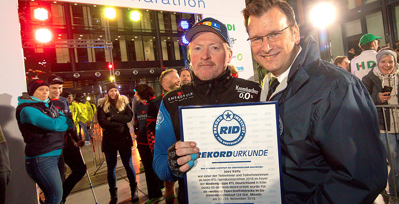 Durch die ständige Bewegung auf der Strecke schmerzten den Rekordanwärtern bald alle Muskeln. Trotz zunehmender Erschöpfung und nächtlicher Kälte blieben die Teams rund um Joey am Ball: Die erforderliche Mindestanforderung von 2.000 km an kumulierter Team-Distanz konnte weit übertroffen werden. Alle Läufer gemeinsam legten in 24 Stunden die Strecke von 3.435,8 km zurück und wurden dafür am 23. November 2018 von RID-Rekordrichter Olaf Kuchenbecker mit einer Rekordurkunde ausgezeichnet, die Joey Kelly stellvertretend für alle Sportler entgegennahm.