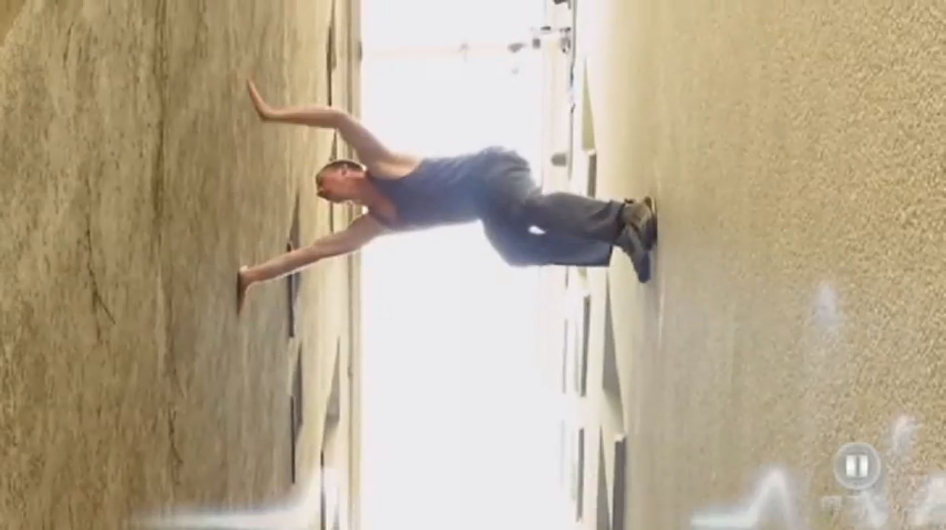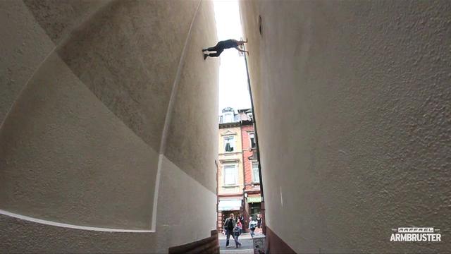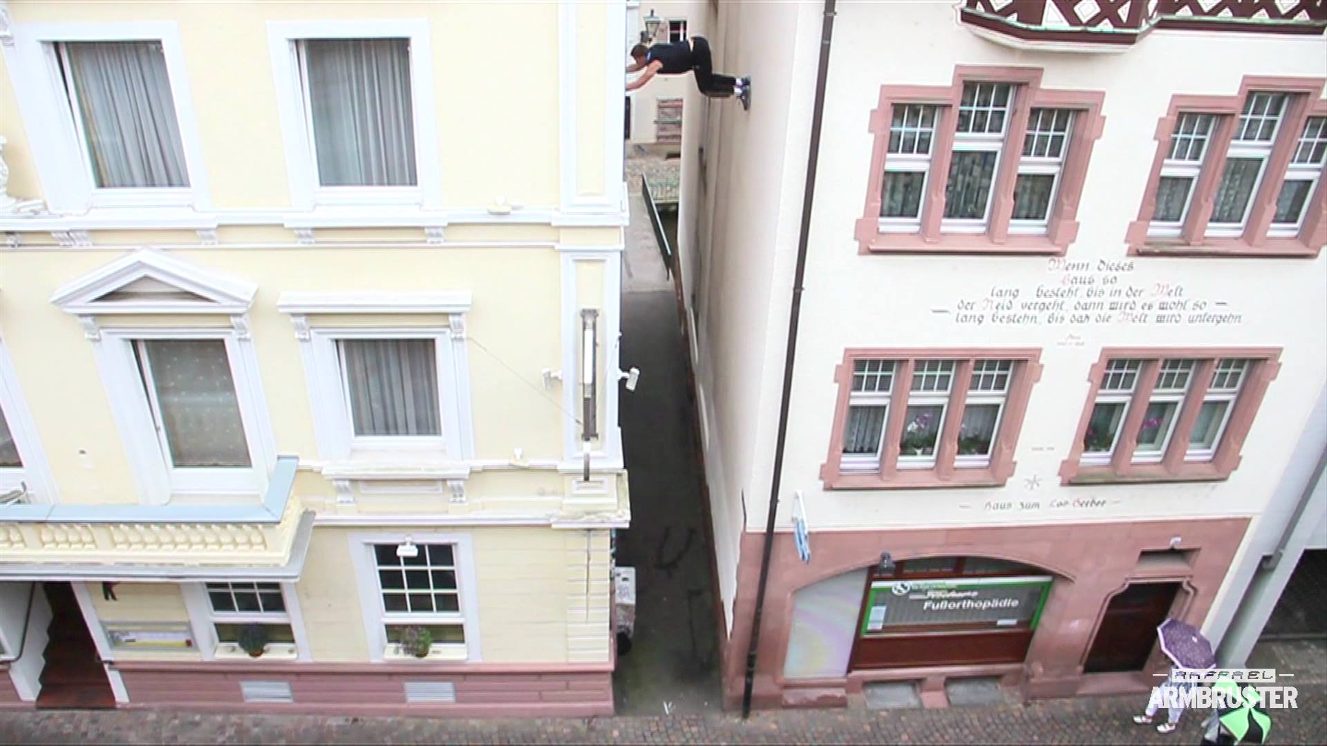 Der Rekordbrecher muss dabei an zwei eng zusammen stehenden gegenüberliegenden Hauswänden hinauf klettern, indem er sich dazwischen einklemmt. Für den Erstrekord verlangte TV-Schiedsrichter Olaf Kuchenbecker eine Zeit von mindestens 20 Sekunden. Doch so lange benötigte Raffael Armbruster dann nicht.