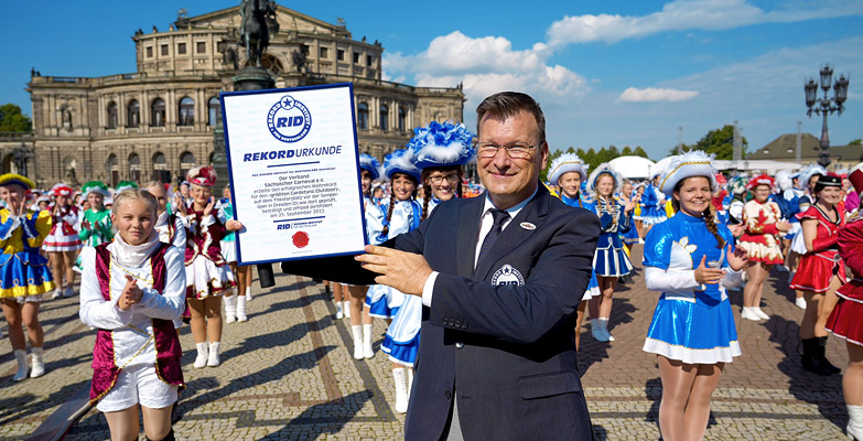 Mit 1.136 regelgerecht Tanzenden in Uniform geht der Weltrekord für die »größte Tanzgarde (Outdoor)« tatsächlich nach Sachsen! Stellvertretend für alle Gardisten zeichnete Rekordrichter Olaf Kuchenbecker die Vertreter des Karnevalverbandes mit einer RID-Rekordurkunde aus. Herzlichen Glückwunsch!Fotos: Benedict Bartsch