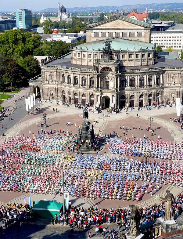 Ebenfalls nach Dresden gereist war RID-Rekordrichter Olaf Kuchenbecker, um die Tanzenden zu zählen und die Einhaltung der Regeln zu kontrollieren. Ab kurz nach 12 Uhr begann der Aufmarsch der mitwirkenden Vereine, in ihren jeweiligen Tanzuniformen gekleidet. Ein buntes, festliches Bild vor der historischen Kulisse Dresdens! Auf das Startsignal des Rekordrichters hin begann der Rekord-Gardetanz. Einige Minuten später konnte Kuchenbecker das Ergebnis verkünden: