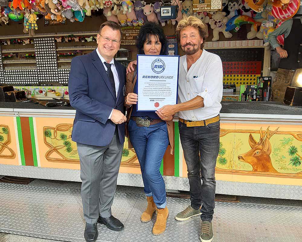 Das Ziel schon im Visier, muss Alfons das Luftgewehr allerdings noch einmal absetzen: ohne Brille geht mittlerweile nichts mehr. Doch dann steht dem Weltrekord nichts mehr im Weg. Dinnebier trifft zehn Mal nacheinander ins Schwarze – und erzeugt das heiß ersehnte 2019er Selfie. Kurz darauf macht Kuchenbecker es mit der Überreichung einer RID-Rekordurkunde offiziell: Maria und Alfons Dinnebier erzielten mit 46 Jahren ohne Pause den RID-Weltrekord für die »meisten jährlich aufeinanderfolgend geschossenen Schießbuden-Selfies«.