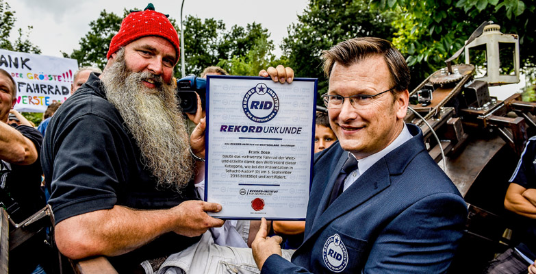 Bereits das Gesamtgewicht von 1.080 kg überbietet den bisherigen Weltrekord eines Belgiers von 860 kg deutlich. Mit der Fahrt aus eigenem Antrieb wurde dann der Beweis angetreten, dass das »Riesenrad« tatsächlich fahrtüchtig ist und sich damit für den Rekord »schwerstes Fahrrad der Welt« qualifiziert.