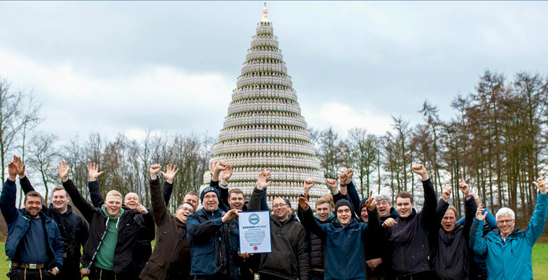 Am 13. Dezember 2019 begannen schon morgens um 6:30 Uhr gut zwei Dutzend Rekordjäger mit dem Aufbau des Bauwerks. Ihr Arbeitsmaterial: 5.038 leere Kornflaschen. Diese haben sie nach eigener Aussage allerdings nicht selbst geleert. »Um Gottes willen! Das schaffst du ja gar nicht!«, erklärt Hauke Böge, Initiator der Aktion. Die Flaschen sammelten die Schleswig-Holsteiner bei Zeltfesten und Gaststätten aus der Region. Sensationelle 20 Etagen hoch schichteten die Freunde, Kollegen und Nachbarn die Glasflaschen pyramidenförmig in die Höhe. Exakt 6,47 Meter hoch und im Durchmesser 4 Meter breit. Die Spitze wird von einer 3-Liter Kornflasche krönt. Insgesamt ein rekordträchtiges Bauwerk!