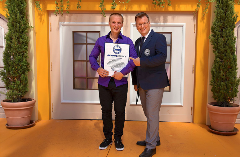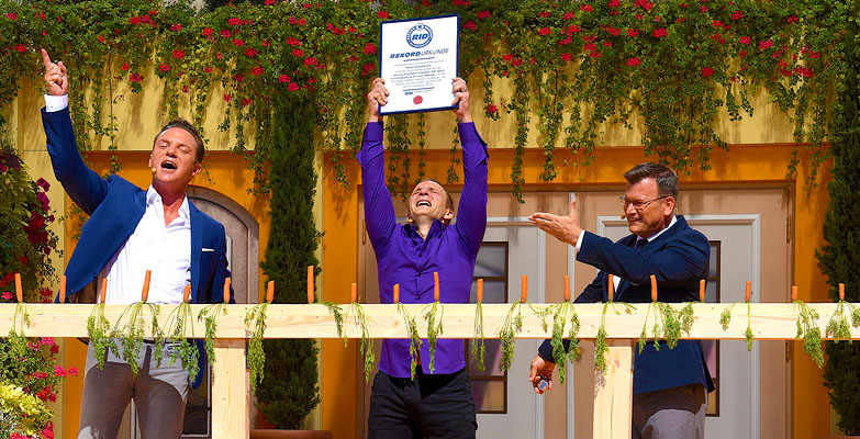 Neben Musik und Stars, Tanzeinlagen und Comedy-Auftritten stehen in der von Entertainer Stefan Mross moderierten Live-TV-Show »Immer wieder sonntags« (ARD, D), übertragen aus dem Europa Park Rust regelmäßig Rekordversuche im Mittelpunkt des Geschehens. Auch am 26. August 2018, als Rekordjäger Milan Zivojinovic dort sein Können demonstrierte.
