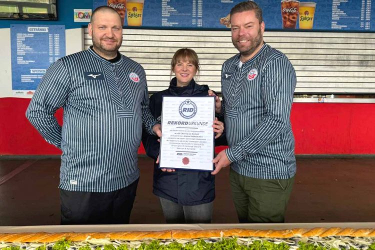 Anschließend wurde das Brötchen zerteilt und an die Gäste des Fußballspiels am Nachmittag verkauft. Über 380 einzelne Bismarckheringsbrötchen konnten aus dem Rekordgericht verkauft werden. Die Erlöse gingen an die Tafeln in Mecklenburg-Vorpommern. Guten Appetit!