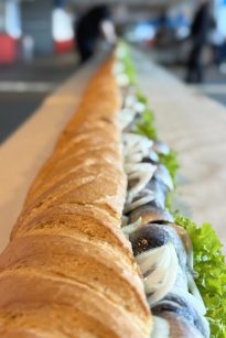 Das Ultra-Brötchen wurde aus 93 kleineren Baguettes zusammengefügt, die längs aufgeschnitten und der Länge nach mit Zahnstochern Stoß an Stoß zusammengesteckt wurden. Üppig belegt wurde die so hergestellte durchgehende Baguette-Unterseite mit Remoulade, Salat, Zwiebeln, Gewürzgurken und natürlich – feinstem Fisch. Ganze 60 Kilogramm Bismarckhering aus Hamburg wurden auf dem Baguette verteilt.