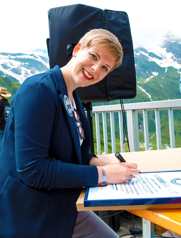 Rekordrichterin Laura Koblischek zertifizierte den neuen Weltrekord für den »höchstgelegenen Country-&-Western-Line-Dance« noch auf der Staumauer mit der Übergabe einer Rekordurkunde, die Daniela Voithofer und die Tourismusdirektorin von Zell am See-Kaprun, Mag. Renate Ecker, stolz entgegennahmen.