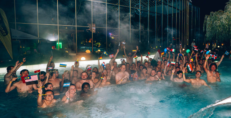 Dieses Mal ging es um die »meisten Nationalitäten im Jacuzzi«. Vorab hatte es – quasi zum Aufwärmen – einen gemeinsamen Sauna-Gang aller Teilnehmenden in der »Russischen Banja«-Sauna gegeben. Um die anwesenden Personen zu zählen und deren Nationalitäten zu erfassen, war RID-Rekordrichter Olaf Kuchenbecker nach Erding gekommen. Dem Klima in der Therme angepasst, trug er kurze Hose und Latschen zum Rekordrichter-Sakko. Derart gewandet begleitete er die Teilnehmenden in die Sauna und überwachte den Einstieg ins Jacuzzi-Becken in Sichtweite der Banja-Sauna. Damit der Weltrekordversuch gültig ist, müssen alle Beteiligten mindestens fünf Minuten im warmen, sprudelnden Wasser verbringen.