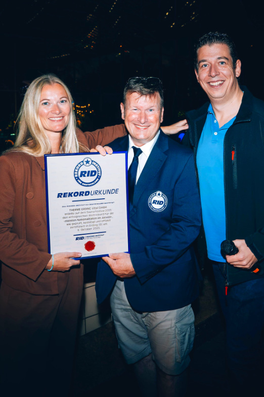 Die Verantwortlichen der Therme Erding zeichnete der Rekordrichter stellvertretend für die Teilnehmenden mit einer RID-Weltrekordurkunde aus.