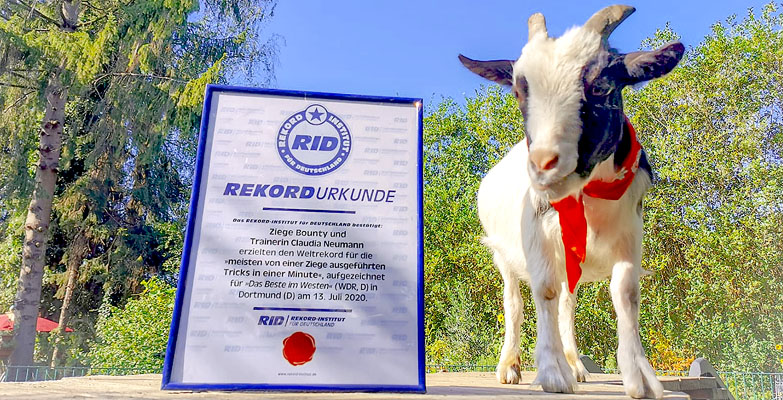 Für den 13. Juli 2020 hatte Claudia Moderator Daniel Aßmann und RID-Rekordrichter Olaf Kuchenbecker zu sich nach Hause nach Dortmund (D) eingeladen, um Bounty offiziell bei einem Rekordversuch prüfen zu lassen. Gemäß Bountys Trainingsvorliebe wollten Claudia und sie die »meisten von einer Ziege ausgeführten Tricks in einer Minute« aufstellen. Um den Erstrekord dieser Kategorie zu erzielen, mussten mindestens 10 als solche erkennbaren Tricks vorgeführt werden. Für eine verbindliche Bewertung hatte die Trainerin eine Liste von 14 Tricks mit entsprechenden Beschreibungen zusammengestellt.