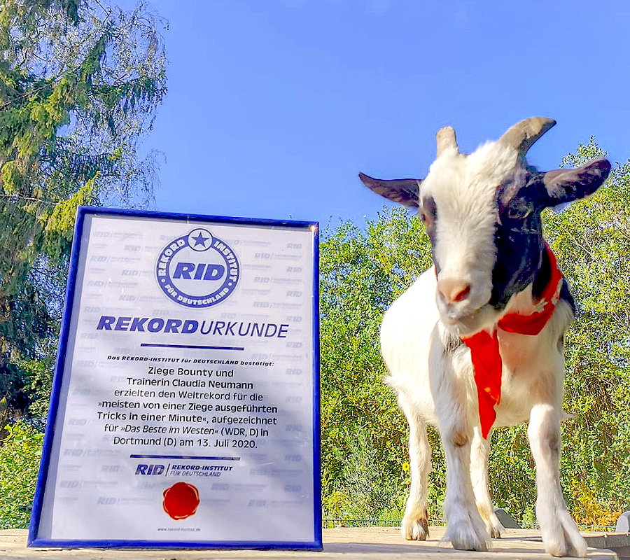 Tatsächlich gelang es Bounty mit Claudias Kommandos alle der 14 Tricks vorzuführen. Nur die Skateboard-Fahrt fand Rekordrichter Kuchenbecker »ein wenig zu kurz für eine Wertung«, sodass er sie nicht zählte. Mit dem Endstand von 13 regelgerecht ausgeführten Tricks erzielen Claudia Neumann und Ziegenbock Bounty den Weltrekord für die »meisten von einer Ziege ausgeführten Tricks in einer Minute«.