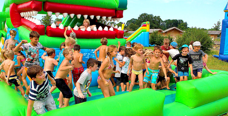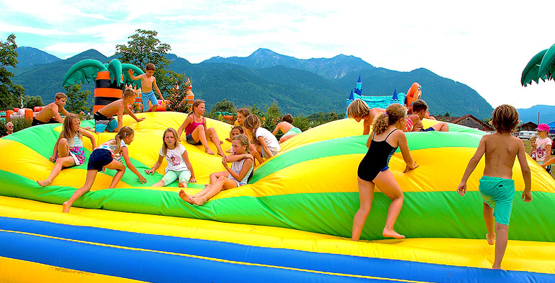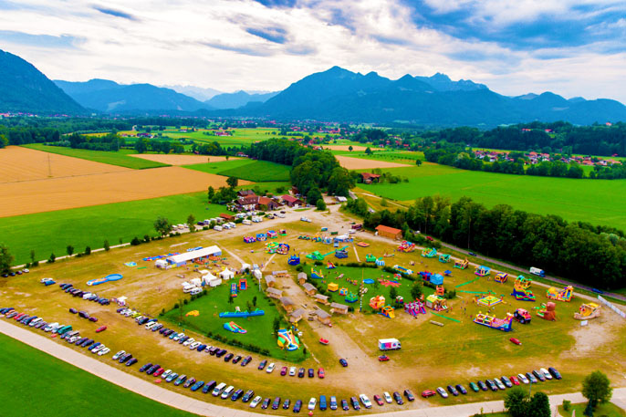 Wo sonst Reaggae-Musik erklingt, waren merkwürdige bunte Gebilde aufgebaut, auf der großen Wiese vom Chiemsee-Sommer im bayerischen Übersee. Denn vom 20. Juli – 6. August 2017 fand dort »Hüpfmania« statt. Quasi ein mobiler Freizeitpark für aufblasbare Spielgeräte, die auf einer Fläche von über 40.000 m² spielbereit nebeneinander standen.