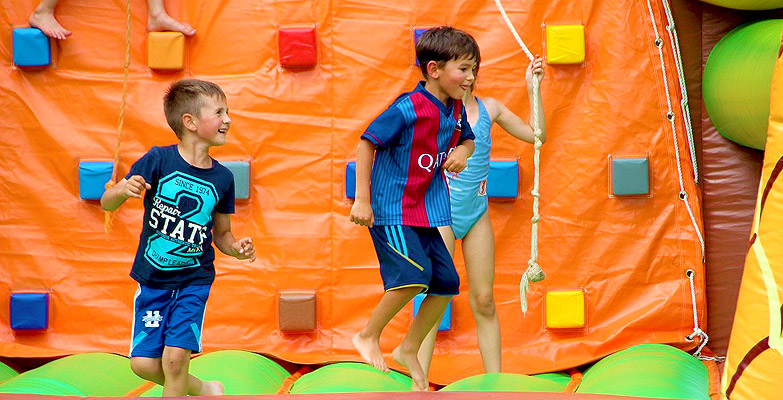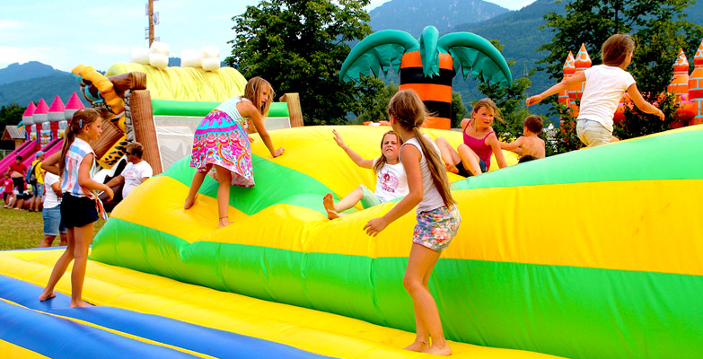 Neben den reinen Hüpfburgen zu verschiedenen Motiven, waren bei sommerlichen Temperaturen die aufblasbaren Wasserrutschen die eigentlichen Highlights.