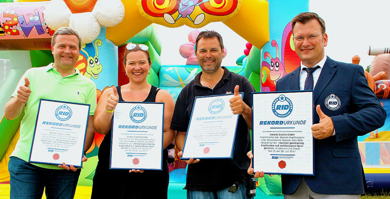 Und gleich für den ersten Tag von »Hüpfmania« hatten sich die Veranstalter, Bayern Hüpfburgen und die Amont Gastro GmbH einen Weltrekord vorgenommen und wollten auf dem Gelände die »meisten gleichzeitig Hüpfenden auf aufblasbaren Spielgeräten« versammeln. Für den Erstrekord dieser Kategorie hatte das REKORD-INSTITUT für DEUTSCHLAND 250 Personen gefordert, die 5 Minuten lang gemeinsam auf den ca. 50 verschiedenen Geräten hüpfen mussten. Zur Überprüfung der Regeln und Zählung der »Hüpfonauten« war Rekordrichter Olaf Kuchenbecker an den Chiemsee gekommen.