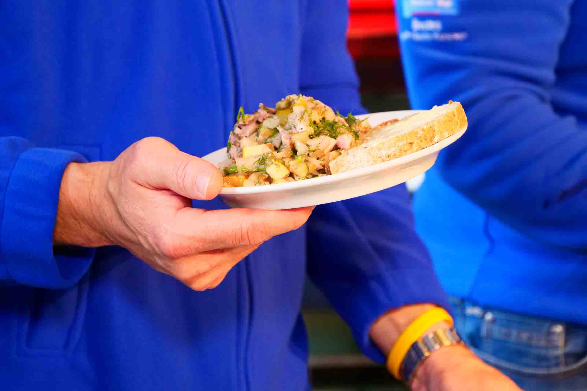 Einen kleinen Moment schwankt der Hubwagen mit integrierter Waage noch, als das fertige Gericht zum Wiegen nach oben gepumpt wird. Dann der prüfende Blick des Rekordrichters: 147 Kilogramm bringt das Matjesgericht auf die Waage, genug für das offiziell »größte Heringshäckerle« der Welt. Kuchenbecker fackelt nicht lange, zertifiziert den neuen Weltrekord und zeichnet den Fischsommelier mit persönlicher Rekordurkunde aus. Dann wird das Häckerle an die hungrigen Gäste ausgegeben, die pro Portion 5 EUR zugunsten des Kinderhospiz Greifswald spendeten.