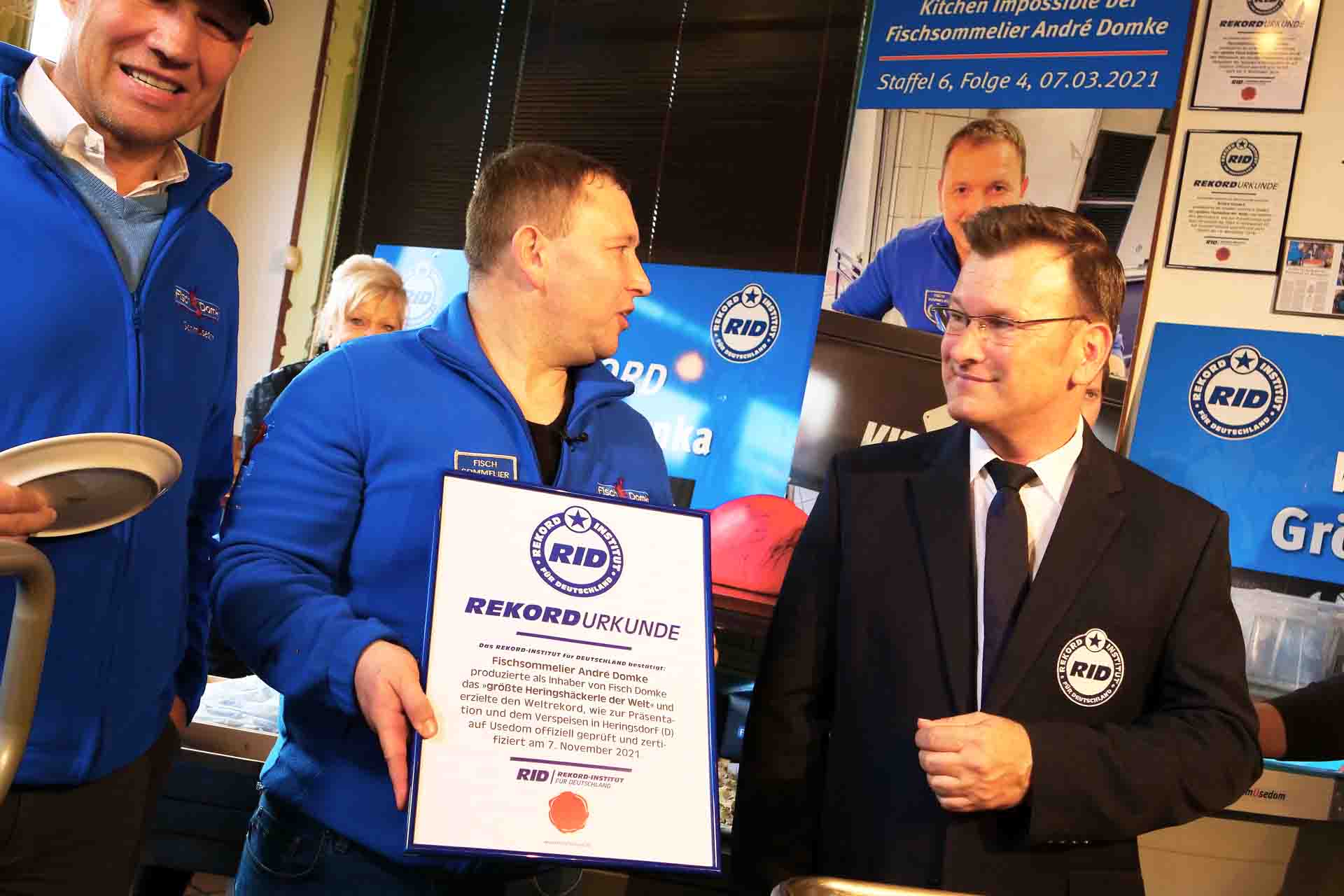 Alle guten Dinge sind drei: Im November 2021 hatte Fischsommelier André Domke wieder großes vor. Schon 2018 war er erfolgreich, indem er die weltweit »größte Fischsülze« und im Folgejahr die »größte Fisch-Soljanka« zubereitete. Nach einem Jahr Pandemiebedingter Pause stand nun erneut ein Riesengericht auf seiner Planungsliste. Am 7. November 2021 wollte der Fischsommelier in seinem Restaurant »Domkes Fischpavillion« in Heringsdorf auf Usedom (D) eine rekordverdächtig große Portion Heringshäckerle – ein Matjessalat nach traditionellem Rezept – zubereiten und gegen Spenden an geladene Gäste ausgeben.