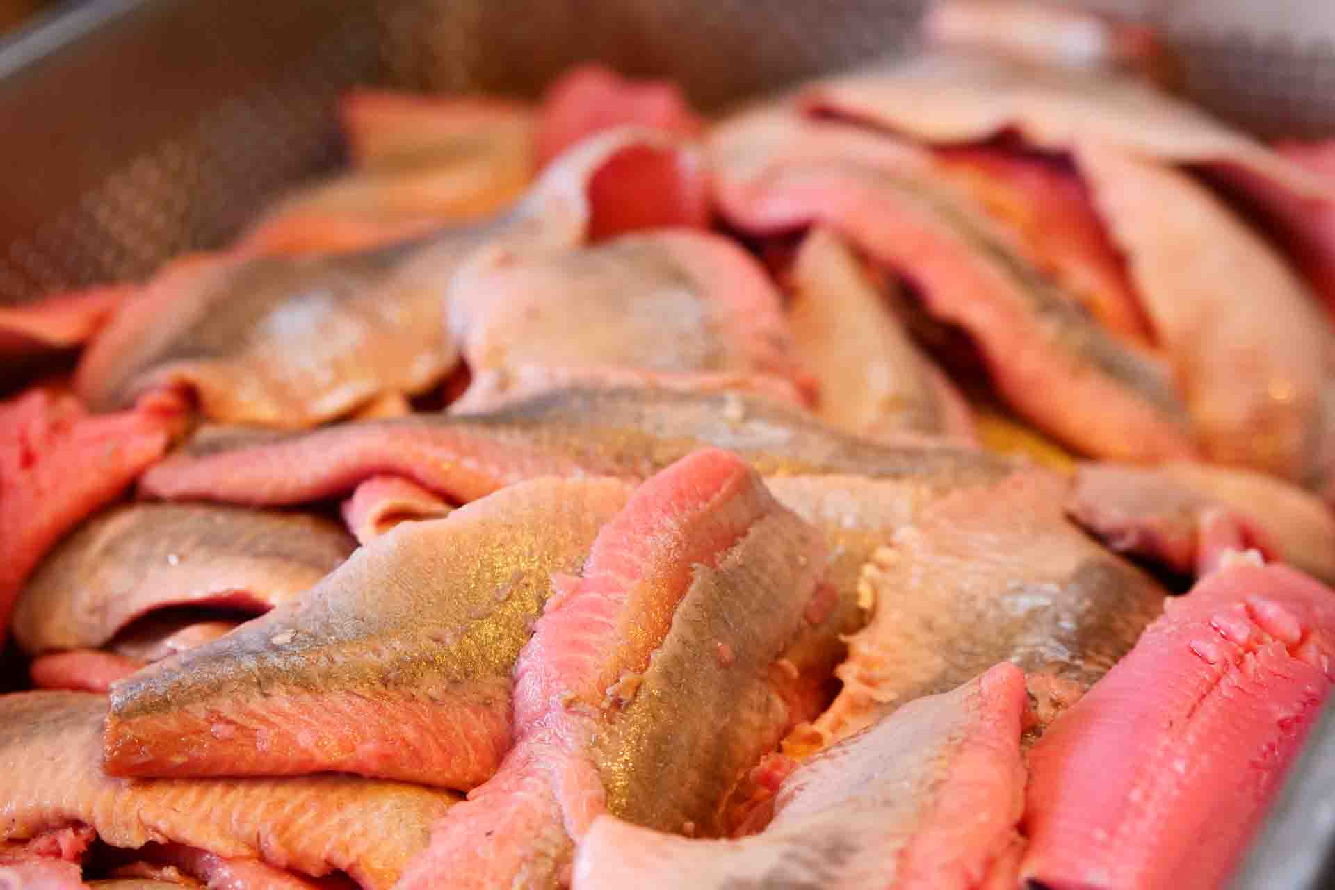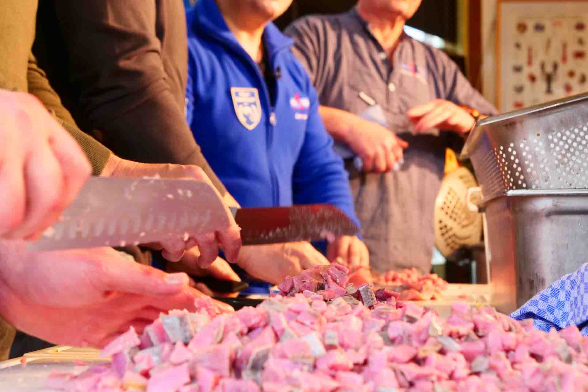 Um die geforderte Portionsgröße von 100 Kilogramm für die neu eröffnete Weltrekordkategorie »größtes Heringshäckerle« zu erreichen, musste Domke vor allem eines: sehr viele Zutaten klein schneiden. Die dabei wichtigste: 70 Kilogramm Rosé-Matjes – ein besonderer junger Hering, der vor der Laichzeit gefangen wird und nach traditionellem Verfahren reift.