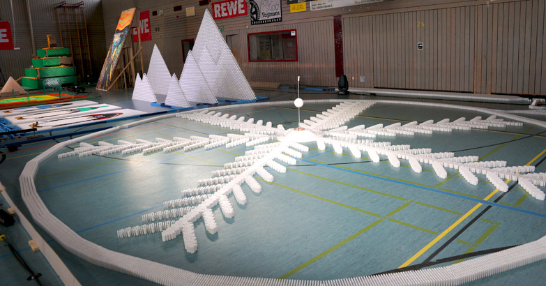 Nachdem die hessischen Domino-Enthusiasten bereits 2014 mit dem Deutschland-Rekord erfolgreich waren, wollten sie die selbst gesetzte Rekordmarke noch einmal toppen. Getreu dem diesjährigen Veranstaltungsmotto »Dominoland – Reaching The Limit«. Und da die Vorjahreshalle in Büdingen in diesem Jahr renoviert wird, zog das 18-köpfige Team kurzerhand um nach Nidda, wo Bürgermeister Hans-Peter Seum (Parteilos) eine Halle zur Verfügung stellte.