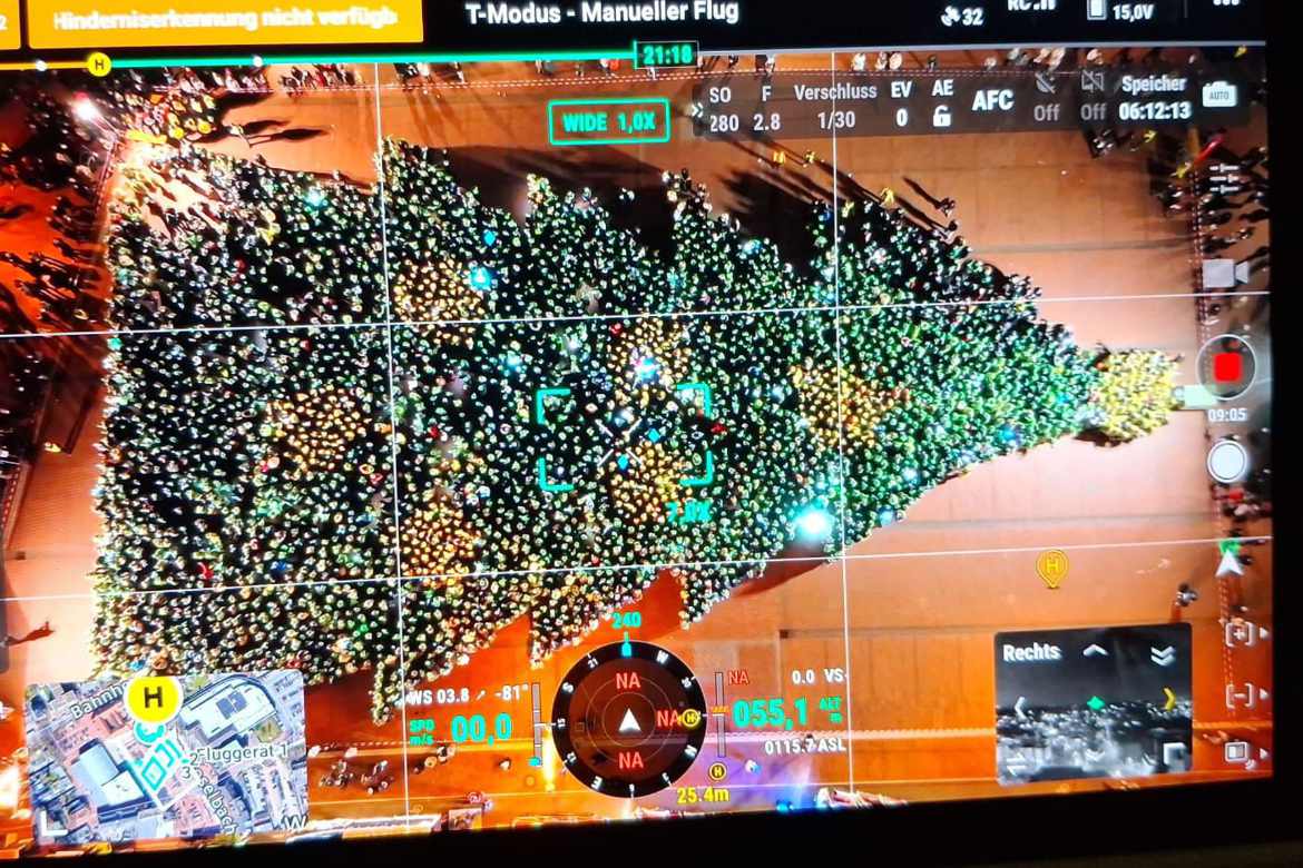 Trompeter Dirk David unterhielt die Menge derweil mit einigen Weihnachtsliedern, die er auf der Hebebühne stehend vortrug. Um 20:30 Uhr war die Platzierung der Teilnehmenden zum Baum abgeschlossen. Darauf ließ sich RID-Rekordrichter Olaf Kuchenbecker auf der Hebebühne in die Höhe bringen, um die Erkennbarkeit der Weihnachtsbaum-Formation persönlich in Augenschein zu nehmen. Nach den Rekordregeln muss ein solcher Baum nach seiner Bildung mindestens fünf Minuten sichtbar sein, was Kuchenbecker mit Stoppuhr überprüfte.