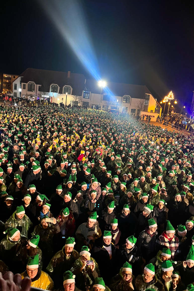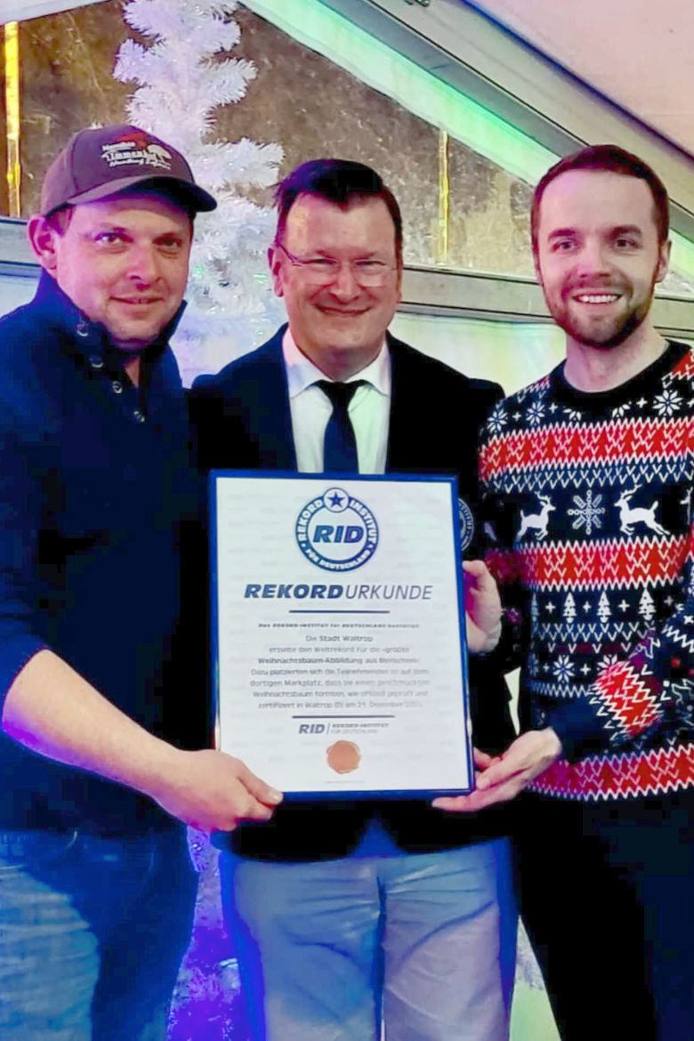 Zur Überbrückung intonierte Trompeter Dirk David den Klassiker »Oh Tannebaum«, den der menschliche »Tannenbaum« kräftig mitsang – drei ganze Durchgänge lang. Dann zertifizierte Kuchenbecker mit 4.812 Personen den neuen Weltrekord für die »größte Weihnachtsbaum-Abbildung aus Menschen« und zeichnete stellvertretend für alle Teilnehmenden Organisator Christoph Zimmer sowie den Waltroper Bürgermeister Marcel Mittelbach (SPD) mit der wohlverdienten RID-Rekordurkunde aus.Fotos: BSV Waltrop 1550 e.V. (3); RID (1)