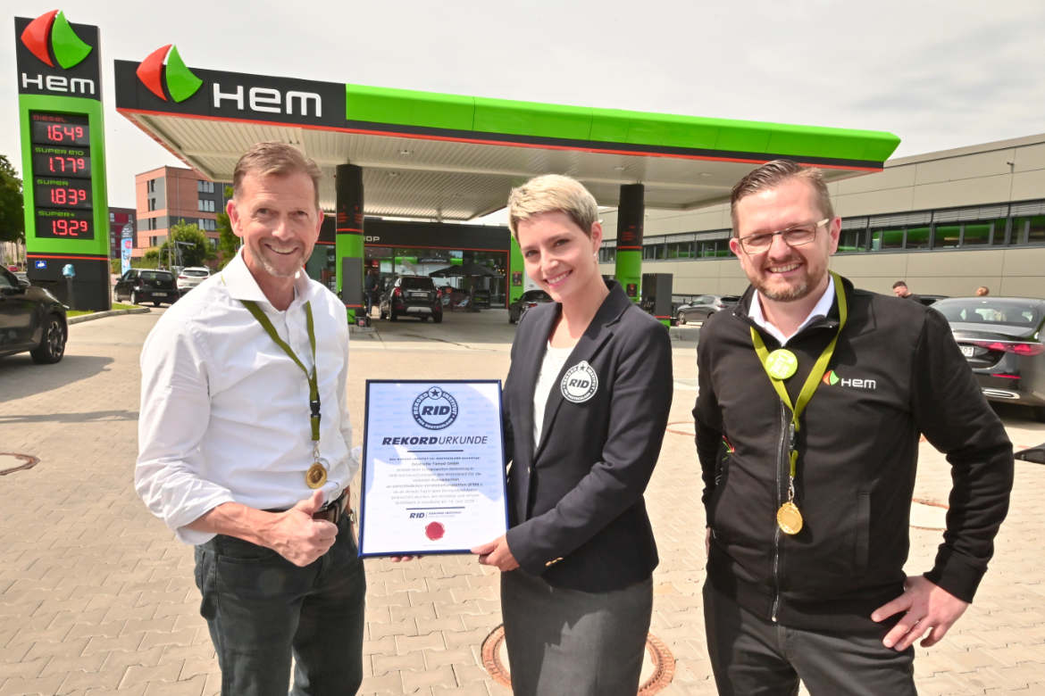 Die »Deutsche Tamoil GmbH« – Muttergesellschaft der deutschen HEM-Tankstellen – erzielte am vergangenen Freitag, dem 14. Juni 2024 den offiziellen RID-Weltrekord für die »meisten Autowäschen an verschiedenen Veranstaltungsorten in 8 Stunden«. Im Rahmen eines bundesweiten Aktionstages in allen HEM-Waschanlagen konnten die Initiatoren während der Aktionszeit 10.199 Waschvorgänge verzeichnen. Beim Weltrekordversuch überwachte das Rekord-Institut für Deutschland (RID) die Zählerstände der Waschstraßen. Der bisherige Weltrekord von 7.197 Autowäschen – 2019 in den USA erzielt – wurde nun deutlich übertroffen.