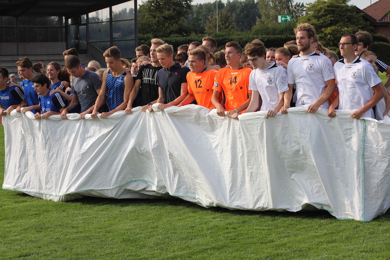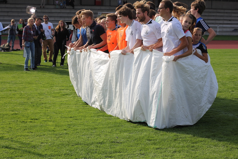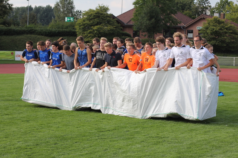 Danach hatte sich das LAZ Unterstützung bei den Volleyballern des TUB Bocholt geholt. Gemeinsam wollte man den Weltrekord für die »meisten in einem Sack hüpfenden Personen« verbessern, der im letzten Jahr in Hamburg auf der Spielplatzolympiade des Alma Terra e. V. aufgestellt worden war. Eine Zahl von 51 zu überbietenden Personen hüpften dort seinerzeit in einem Sack und legten so gemeinsam 10 m hüpfend zurück.