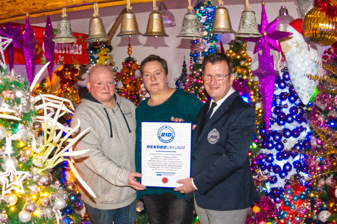 Und er nutzte den spärlichen freien Platz innerhalb der prächtigen Weihnachtsbaumdekorationen, um die Jeromins mit ihrer verdienten offiziellen RID-Rekordurkunde auszuzeichnen.
