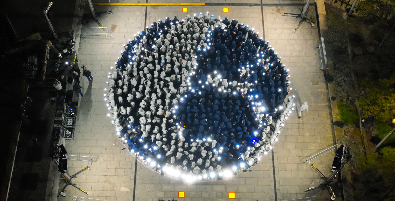 Gehüllt in farbige Kapuzenpullover in grau und blau trotzten die Teilnehmerinnen und Teilnehmer dem tristen Berliner Winterwetter und rückten ganz dicht zusammen, als sie ihre Formation gegen 17 Uhr vor der Axel-Springer-Konzernzentrale starteten: Mit Grau formten sie die Kontinente, mit Blau die Ozeane. Die Positionen für die Teilnehmenden waren vorab mit Kreide auf den Boden gezeichnet worden. In der aufkommenden Dunkelheit wurde das Weltkugel-Bild mit weißen Lichtern aus hellen Spots komplettiert.