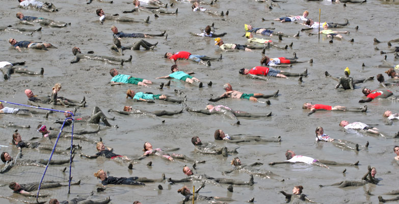 Abkühlung versprachen allerdings die Aktivitäten, um derer willen Wattkämpfer und Schaulustige über den Deich gekommen waren. Bei diesen »schmutzigen Spielen für eine saubere Sache« geht es neben allem Spaß am Schlick um die Unterstützung der landesweiten Krebshilfe. Seit Jahren werden mit den Spielen um »Matsch und Ehre« in verschiedenen Watt-Sportarten Spenden für lokale Projekte generiert, um »Strukturen für Krebsbetroffene in der Region nachhaltig zu verbessern«.