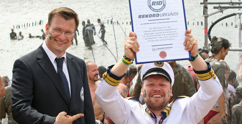 Und zum 10. Geburtstag hatten sich die Organisatoren etwas ganz besonderes überlegt. Vor den eigentlichen Wattkämpfen wollten sie einen in St. Peter-Ording aufgestellten Weltrekord brechen und nach Brunsbüttel holen. Bei den »meisten gleichzeitig ausgeführten Wattengeln« müssen mehr als 280 Teilnehmer im weichen Watt auf dem Rücken liegen und wie klassische Hampelmänner und -frauen mit Armen und Beinen wedeln, um dort ihre Spuren zu hinterlassen.