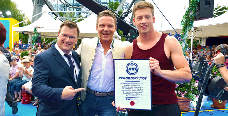 Sportlicher wurde das Programm mit Olympiasieger Matthias Steiner, der sich als Schlagersänger erfolgreich ein zweites Standbein aufbaut. Dann trat Raffael Armbruster in Erscheinung, der sich bei »Immer wieder sonntags« gewissermaßen auf »heimischen Boden« einen Weltrekord sichern wollte. Der in seiner alten Heimat Freiburg durch das Hobby »Gassenklettern« bekannte Raffael lebt mittlerweile als Stuntman in Berlin, und probt in seiner Freizeit eine Artistik-Performance.