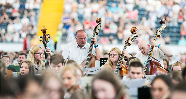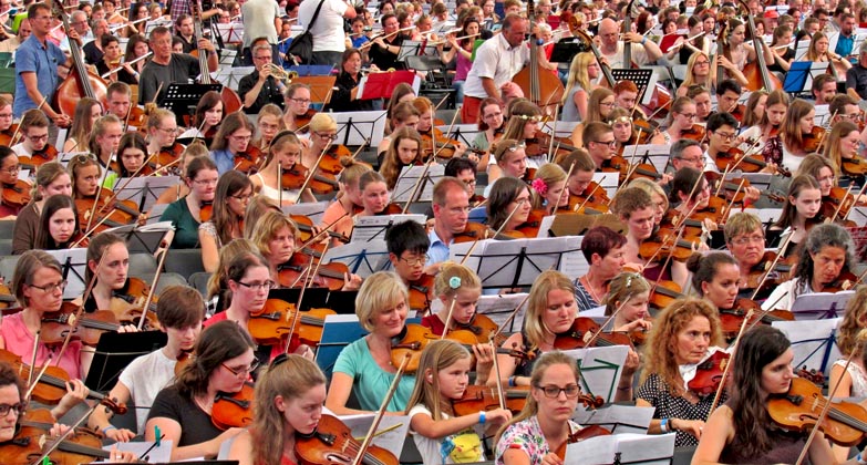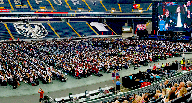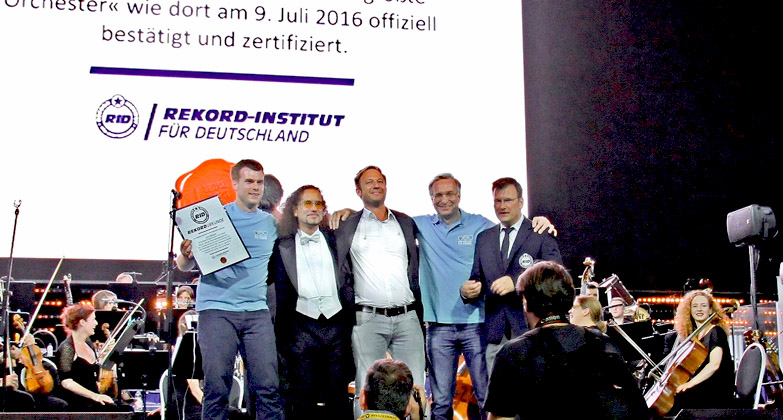 Nach mehr als drei Jahren Vorbereitungszeit inklusive der Suche nach einem neuen Veranstaltungsort, war der lang ersehnte Termin endlich gekommen, als am 9. Juli 2016 exakt 7.548 Musiker aus ganz Deutschland in die Commerzbank-Arena nach Frankfurt kamen, um dort gemeinsam mit der Neuen Philharmonie Frankfurt ein rekordverdächtiges Konzert als »größtes Orchester der Welt« zu geben.